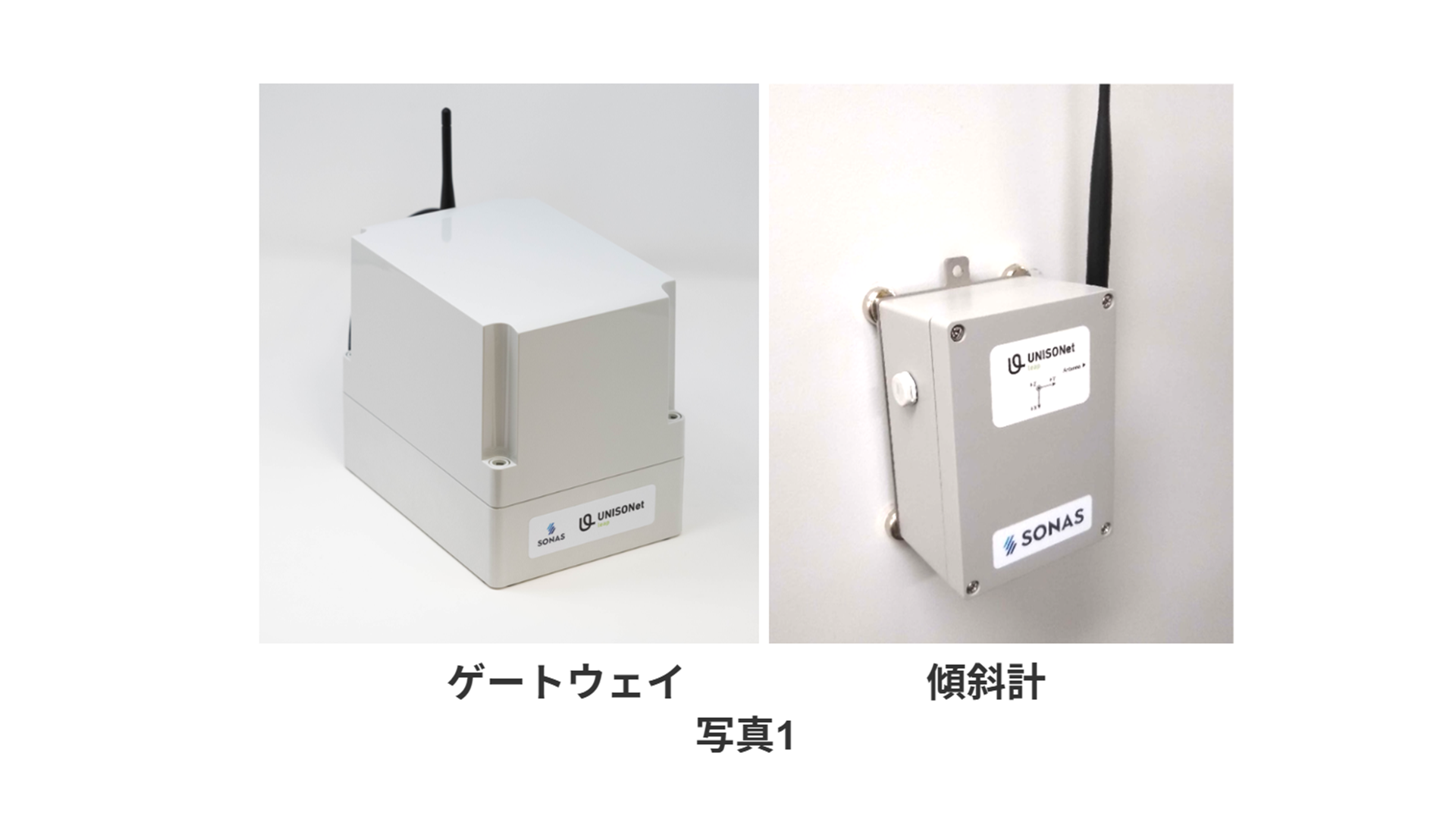 ソナスの無線式 傾斜監視システムは、親機である「ゲートウェイ」と子機である「傾斜計」で構成されるシンプルな仕組みです。(写真1)