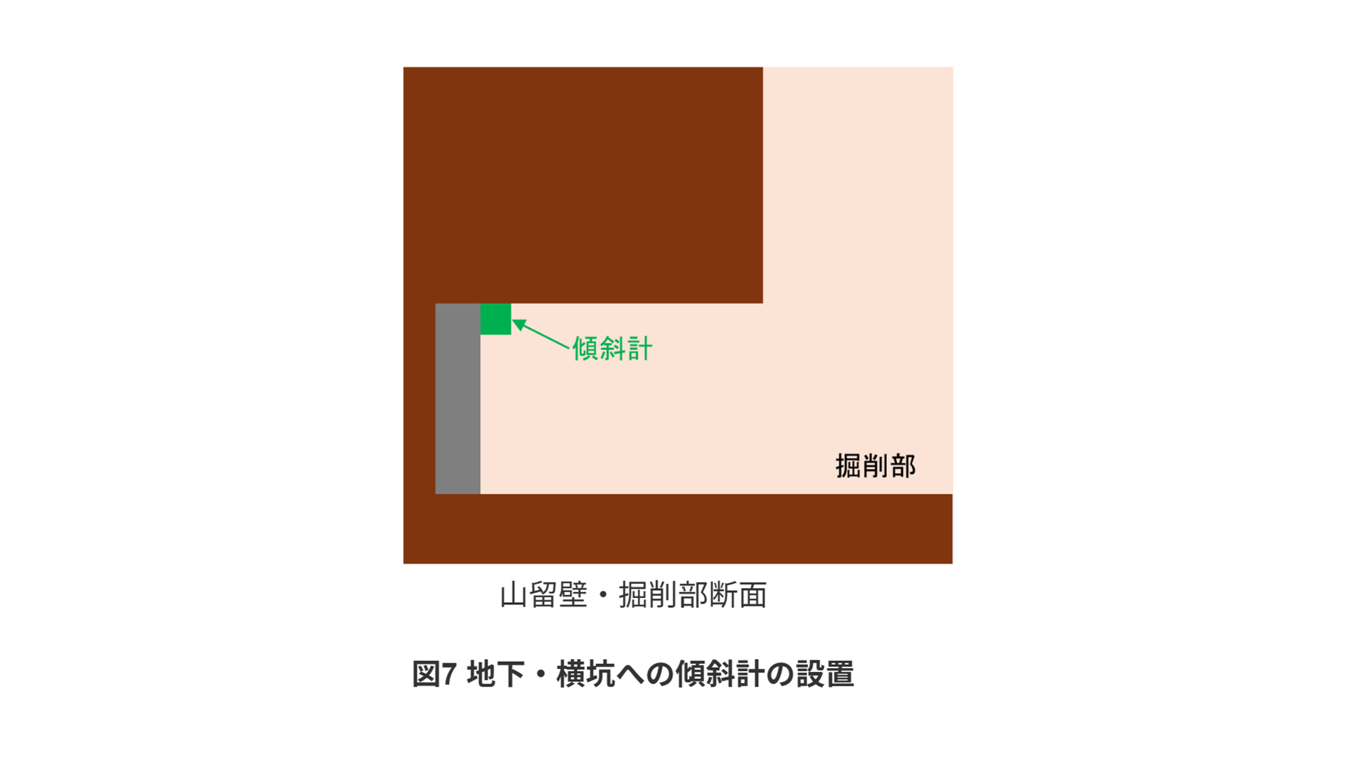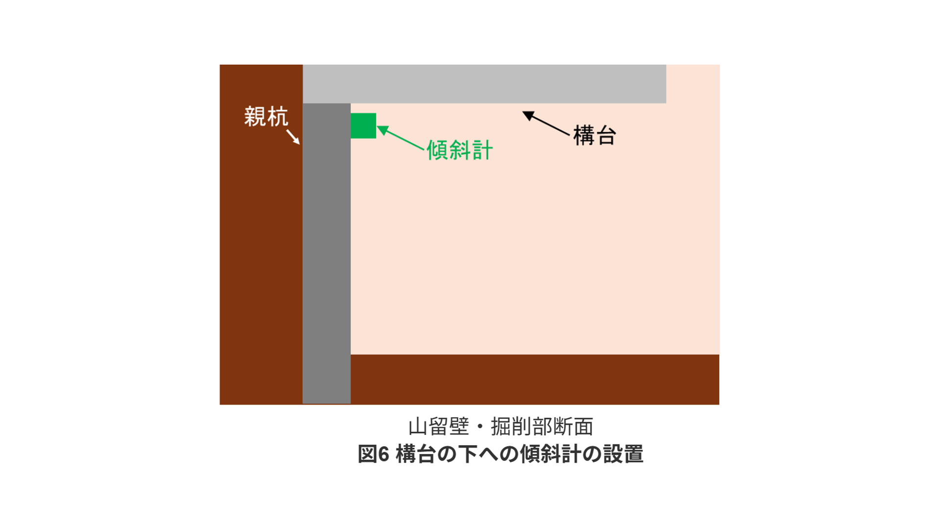 掘削部のすぐ横に構造物や道路などがあり近接施工となる場合も、傾斜計の設置数量を増やします。逆に掘削部の横に何もない場合は傾斜計を取り付けない事もあります。(図5)