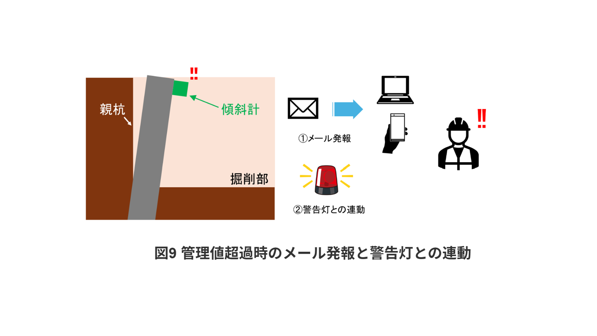 山留の変位が管理値を超えた際に遅延なく速やかにメール通知されることはもちろん、警告灯との連動により、現場で働く作業員へ、光と音で危険の兆候を知らせることができます。(図9)