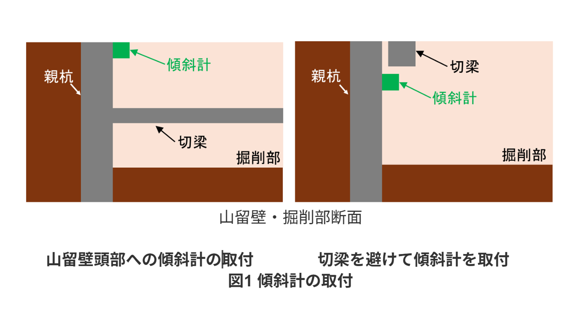 傾斜計は通常、山留壁の頭部に取り付けます。切梁などがある場合は、障害物を避けて取り付けます。(図1)