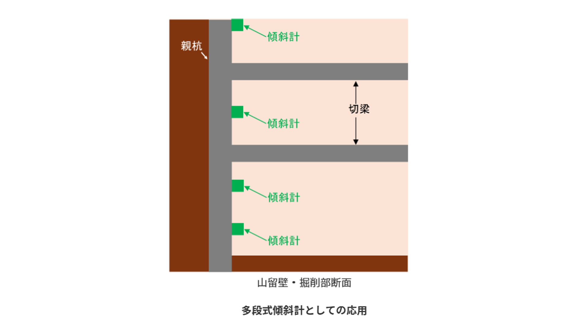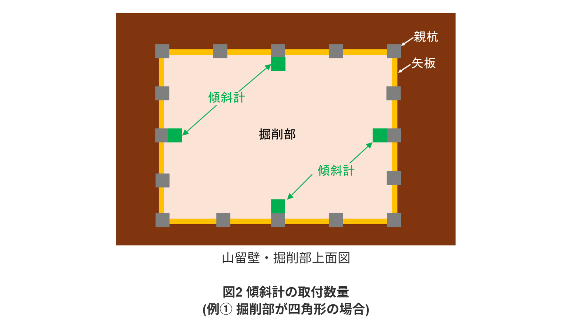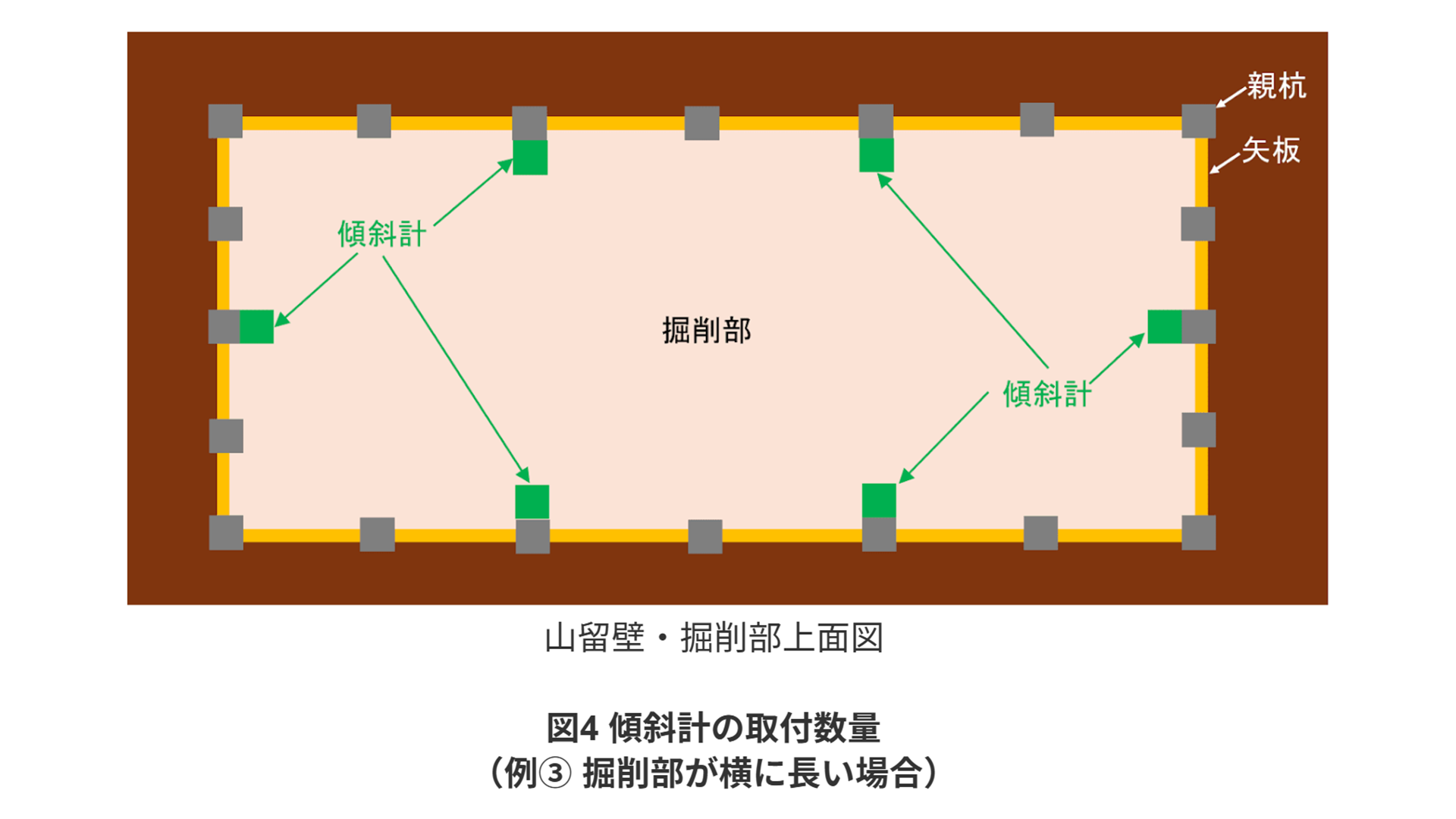 山留壁1面が長い場合は、傾斜計の設置台数を増やします。(図4)