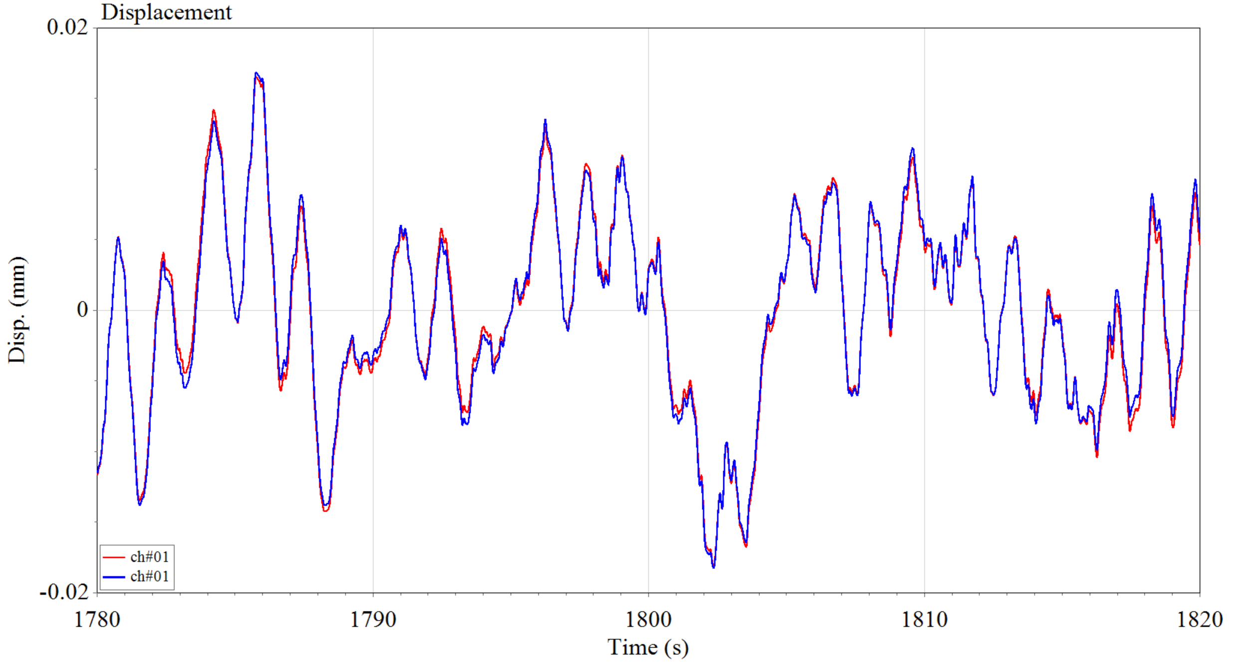 加速度からの2階積分として算出した結果により、5~20μm程度の変位を捉えることができた。本システムは計測端末同士で高精度に時刻同期が取れているため、隣接した複数台の微動計から得られた変位においても波形が重なる様子が確認できる。